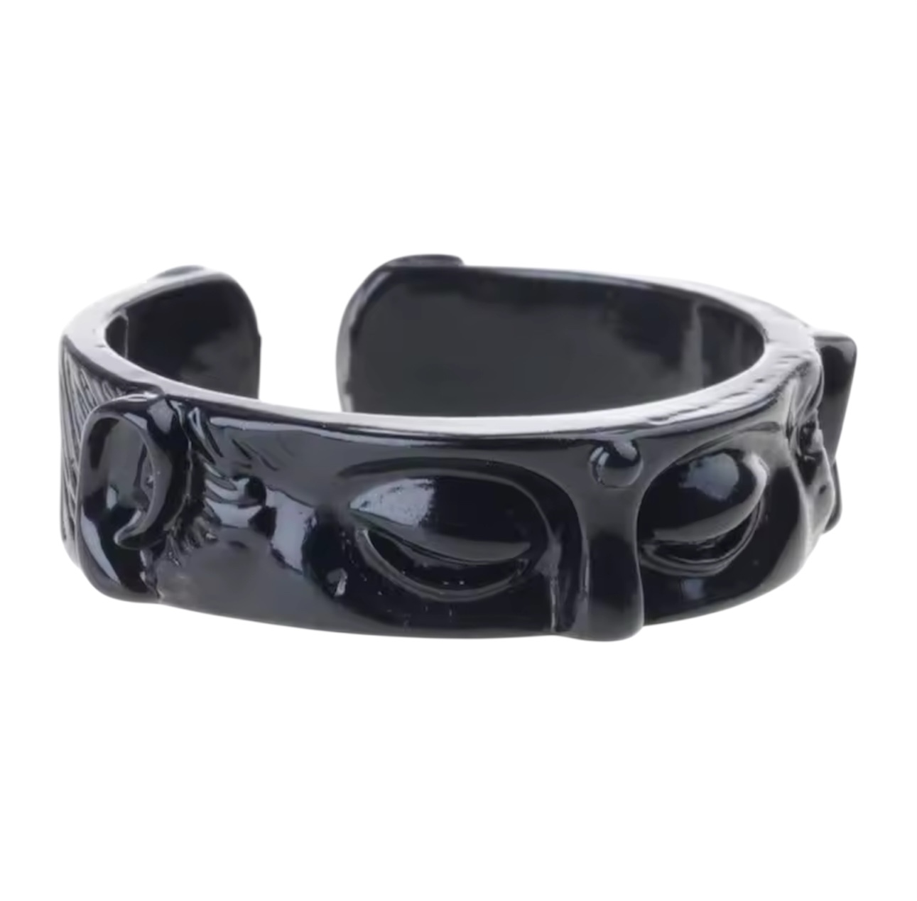 Deze bijzondere ring stelt de ogen van Buddha voor – een symbool van wijsheid, verlichting en innerlijke rust. De zwarte uitvoering geeft de ring een krachtige en mysterieuze uitstraling.